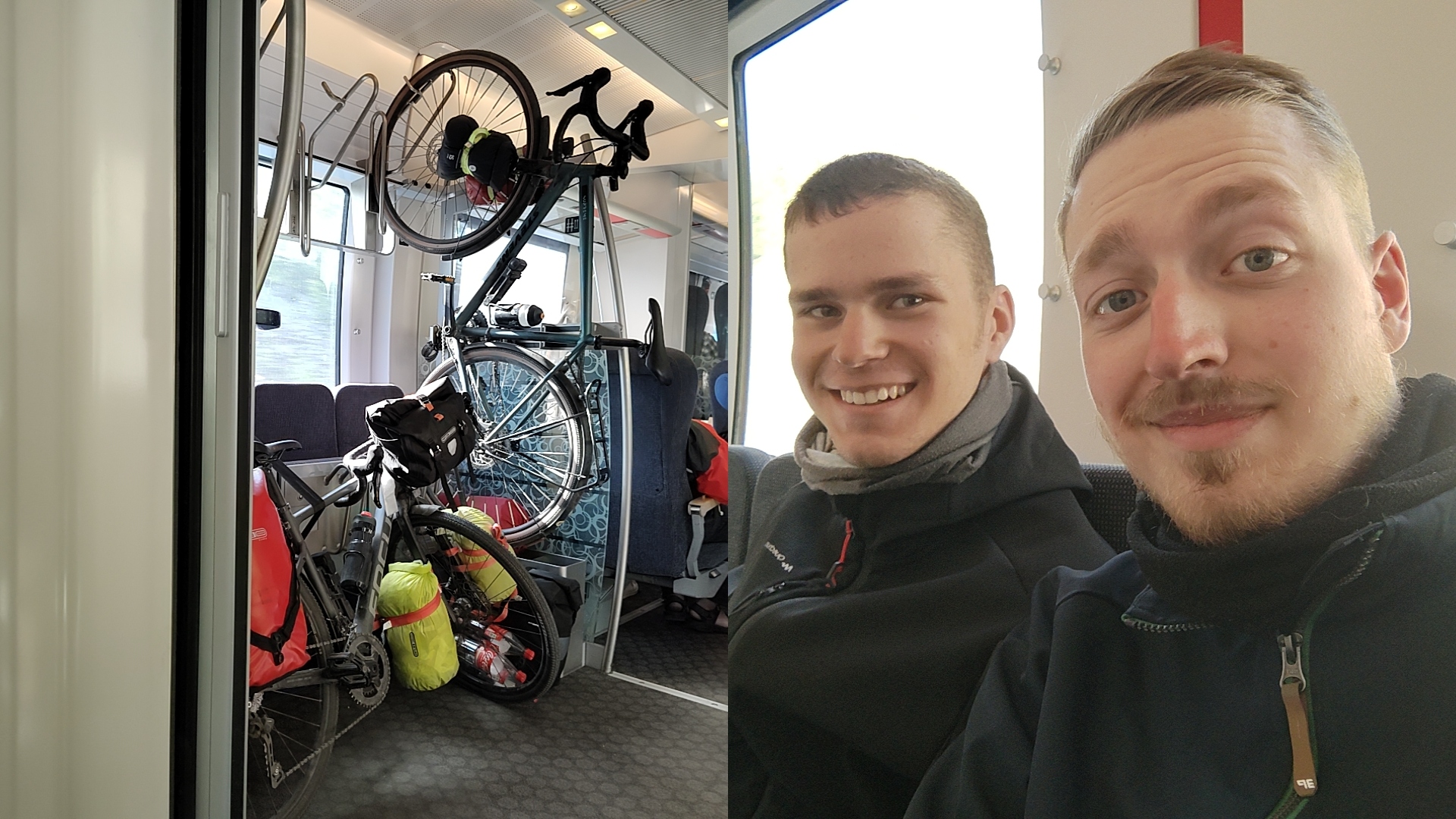 Im Zug war die Fahrradtransport-Situation ein wenig spannend. Denn auf den Fahrradplätzen saßen Leute. Wir haben uns also einfach in den Gang gestellt, wo natürlich dann niemand mehr durchkommen konnte.