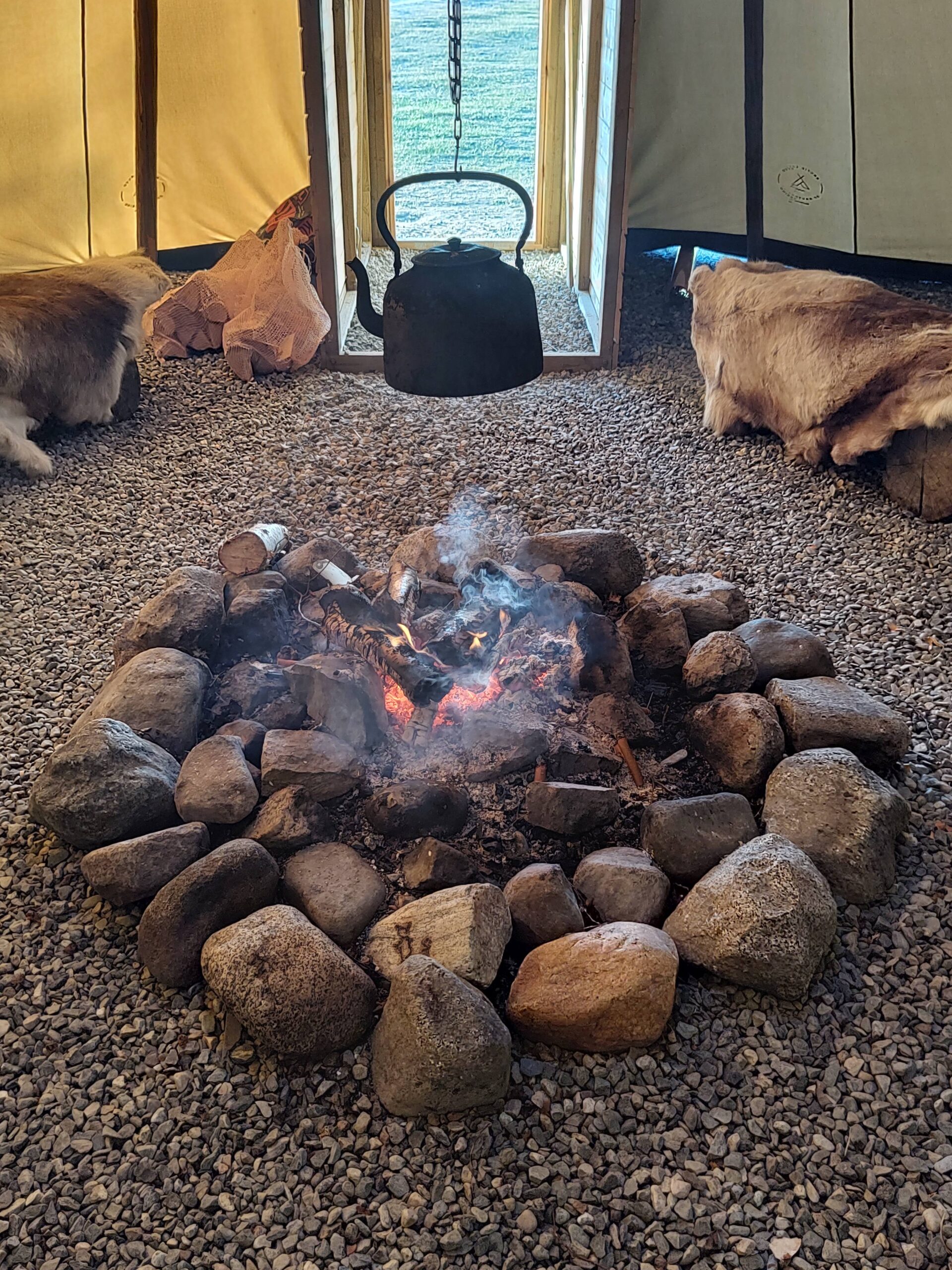 Und jetzt sitzen wir in einem Tippi auf dem Zeltplatz, denn schon bei der Anreise wurden wir zu Kaffee und Lagerfeuer eingeladen.